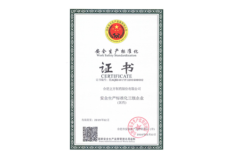2016安全標(biāo)準(zhǔn)化證書(醫(yī)藥)(股份)