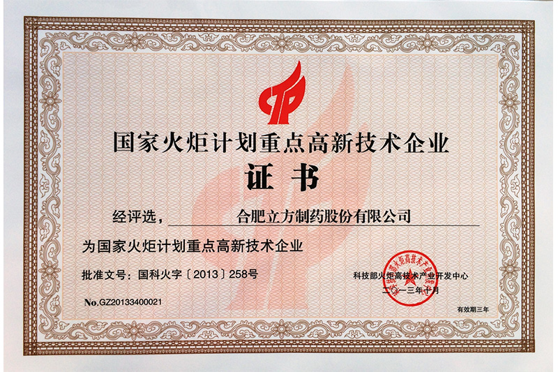 立方制藥 國(guó)家火炬計(jì)劃重點(diǎn)高新技術(shù)企業(yè)證...